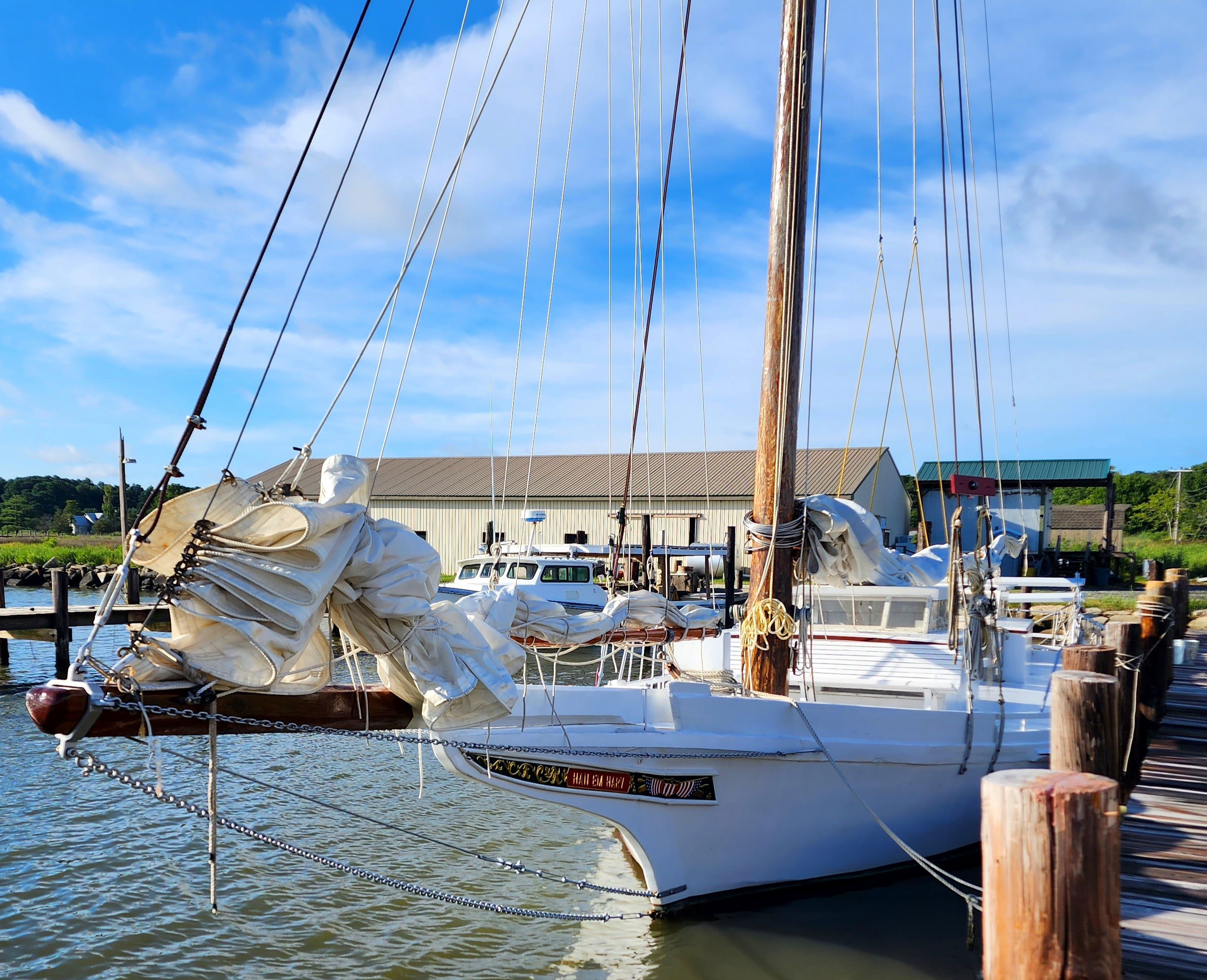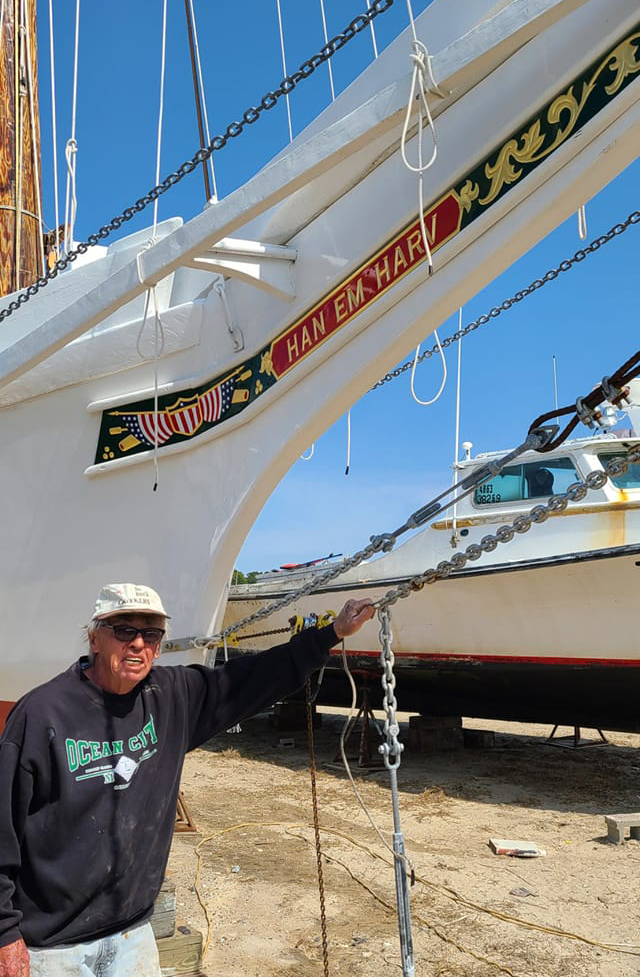 Inevitably, circumstances change, time flies, money gets short. Whatever the reasons, more than three years later, she was still sitting there, and Stoney Whitelock bought her in 2019. He put enough plywood on her sides to get her back in the water and down to Deal Island, where he spent two and a half years restoring her. Late in 2019, he had the restored hull back in the water and floated down to Crisfield for fiberglassing. The rest of the boat was finished in time to race at Deal Island in 2021, where she came in third. Stoney renamed her "Han Em Harv" after his grandchildren, Hanna, Emily and Harvey. She now sails out of Deal Island as a pleasure craft and takes out sailing parties.