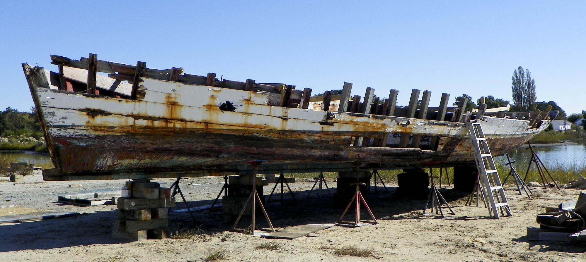 By 2009, we found her back across the Bay, on land at Cape Charles, Virginia, still (or again?) awaiting restoration. Some work had been done on her, but the effort clearly had stalled and she looked lonesome and neglected. She remained there for six years until rescued yet again, this time by Deal Island Skipjack Preservation.