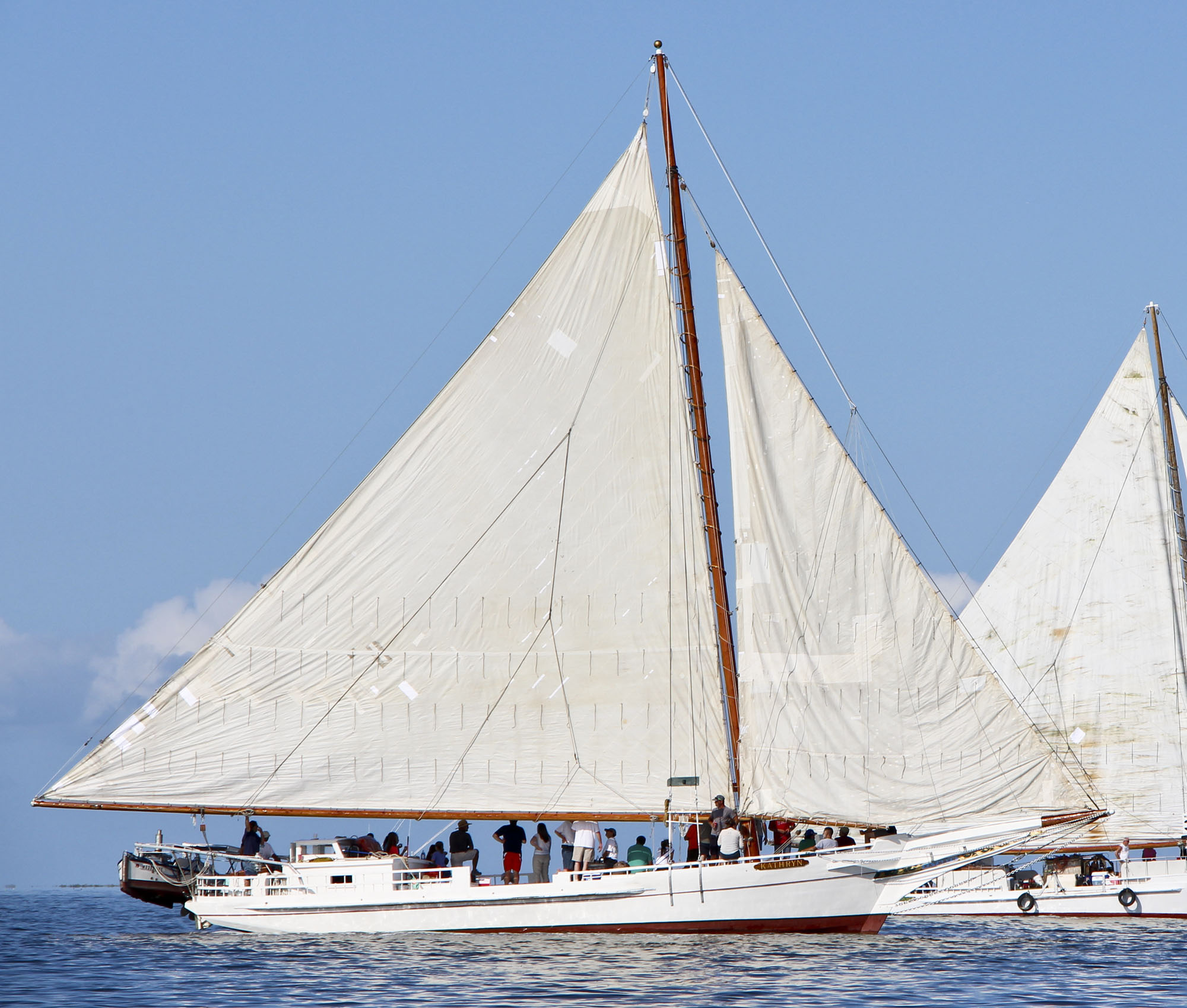 There is another account of a storm while Johnnie Parkinson was captain, which may or may not have been the same one. In this account, Kathryn was caught in a sudden storm with 80-mph winds, and before the sails could be lowered, the boat went over so far that the port side of the cabin was under water.