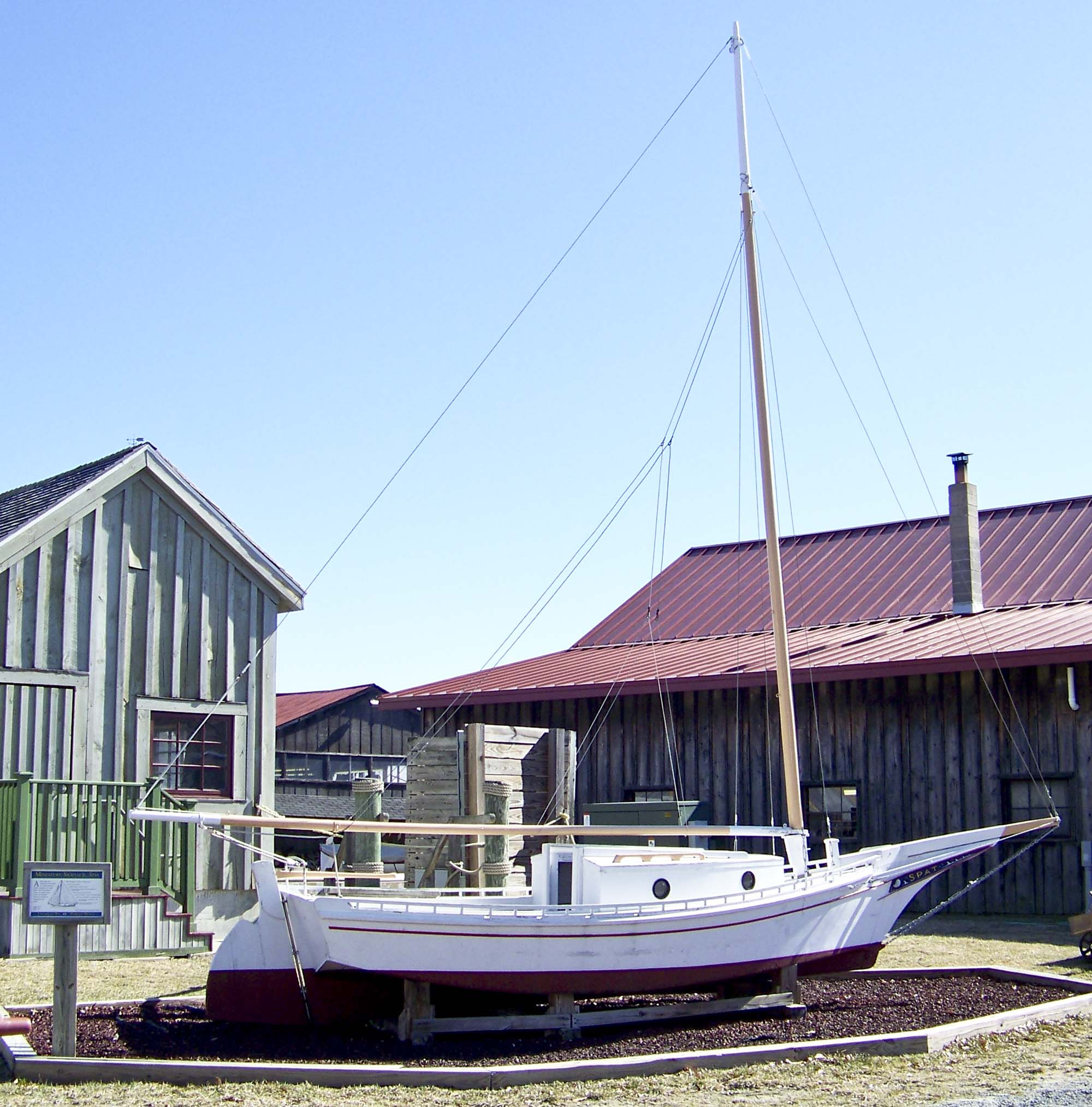 Spat was built in 1969 by Curtis Applegarth as a recreational vessel. She was donated to the Chesapeake Bay Maritime Museum by Wilbur Banderson, Thomas C. Banderson and Bessie E. Banderson in memory of Capt. James (Butch) O. Banderson. In poor condition at the time, the museum installed her as a land exhibit. After her condition deteriorated further, they took the lines from her and rebuilt Spat as a volunteer project in the museum's boat shop.